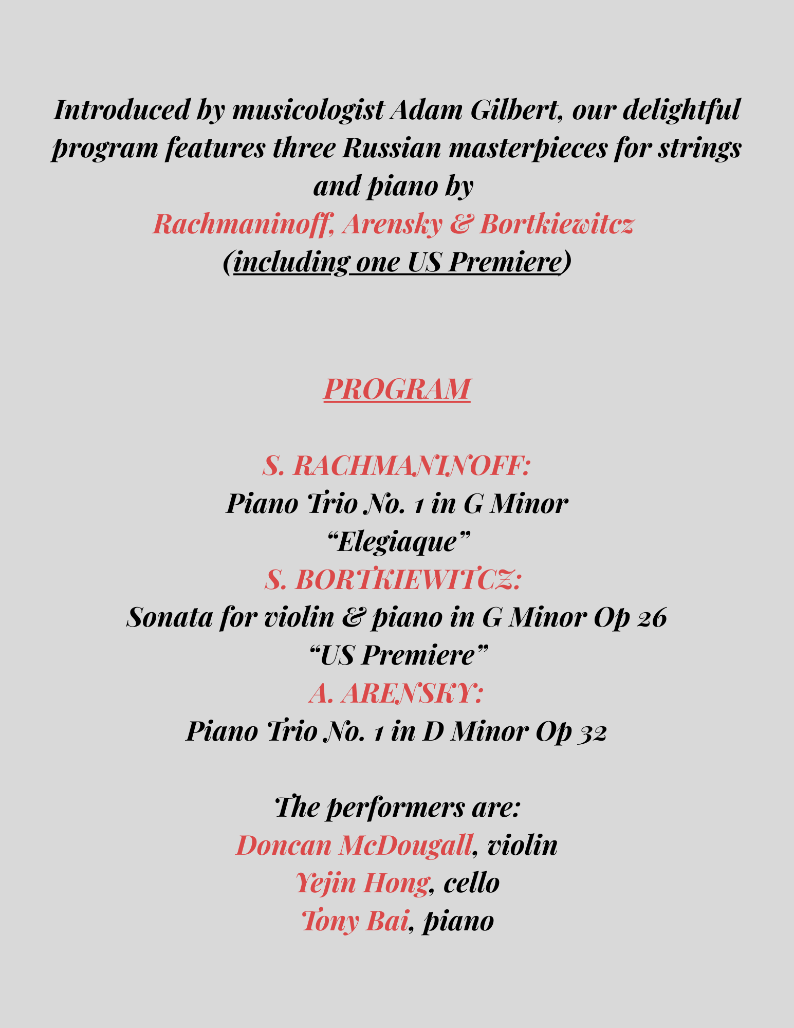 After the concert, meet the artists and enjoy French champagne, high tea buffet from De La Vina.