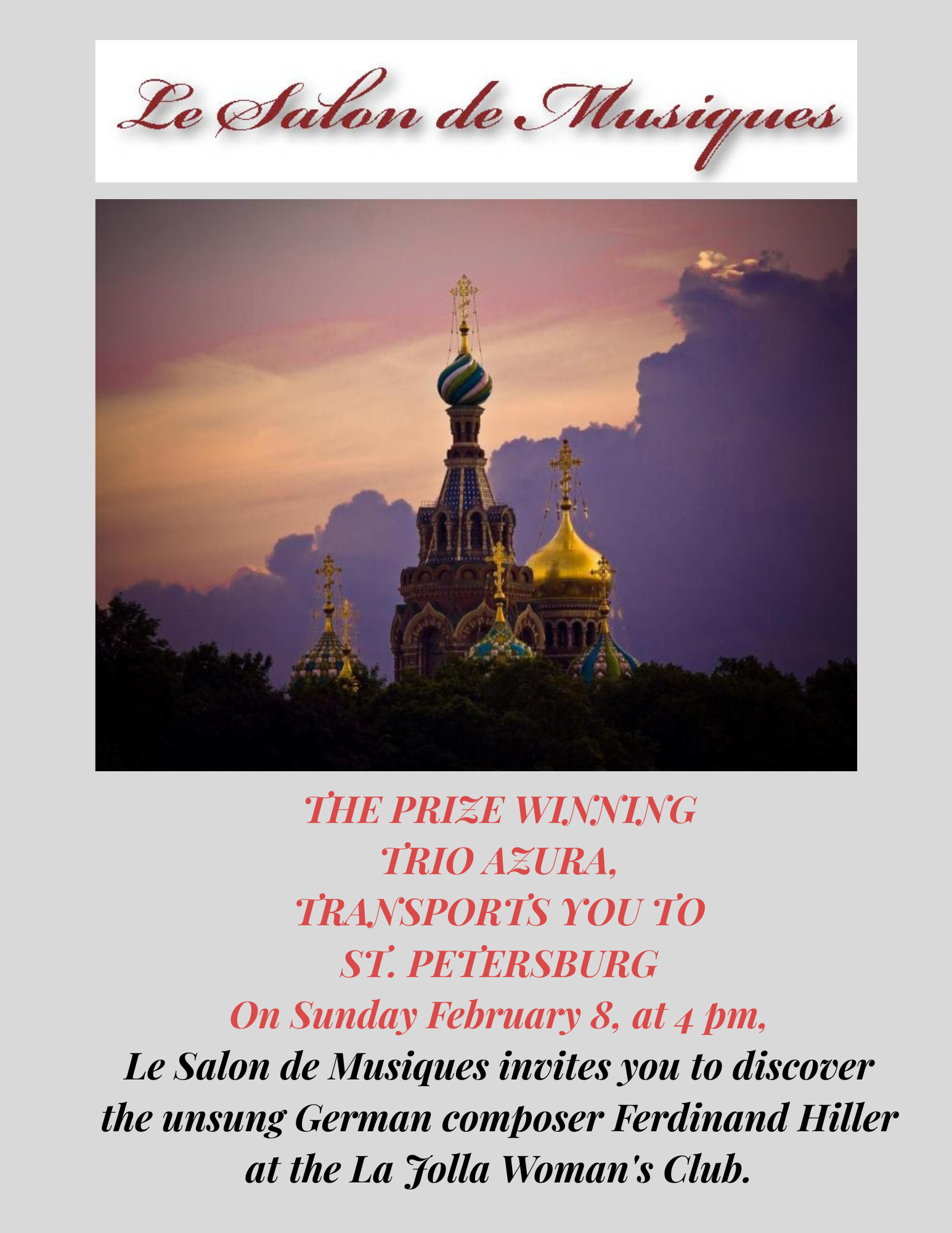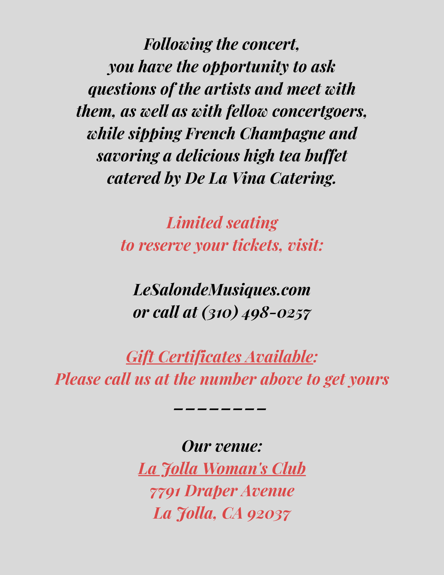 To reserve your ticket, visit LeSalondeMusiques.com or call (310) 498-0257