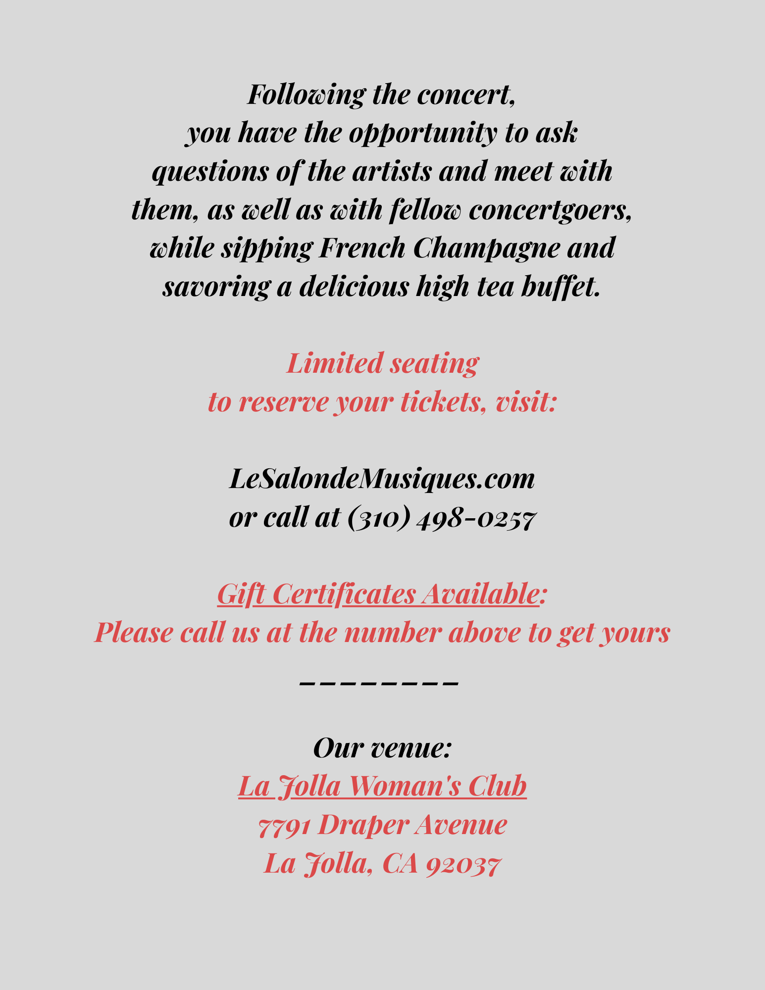 To reserve your ticket, visit LeSalondeMusiques.com or call (310) 498-0257