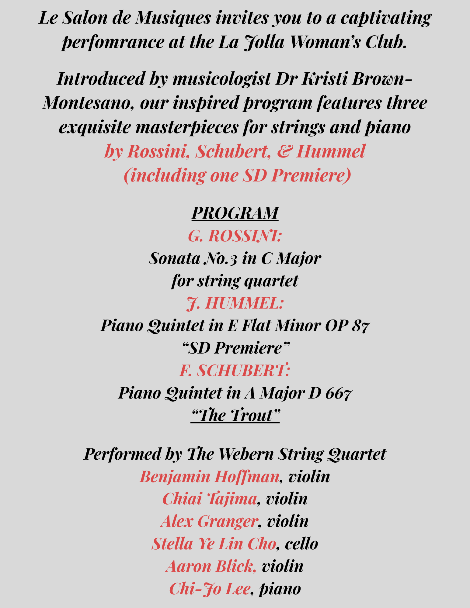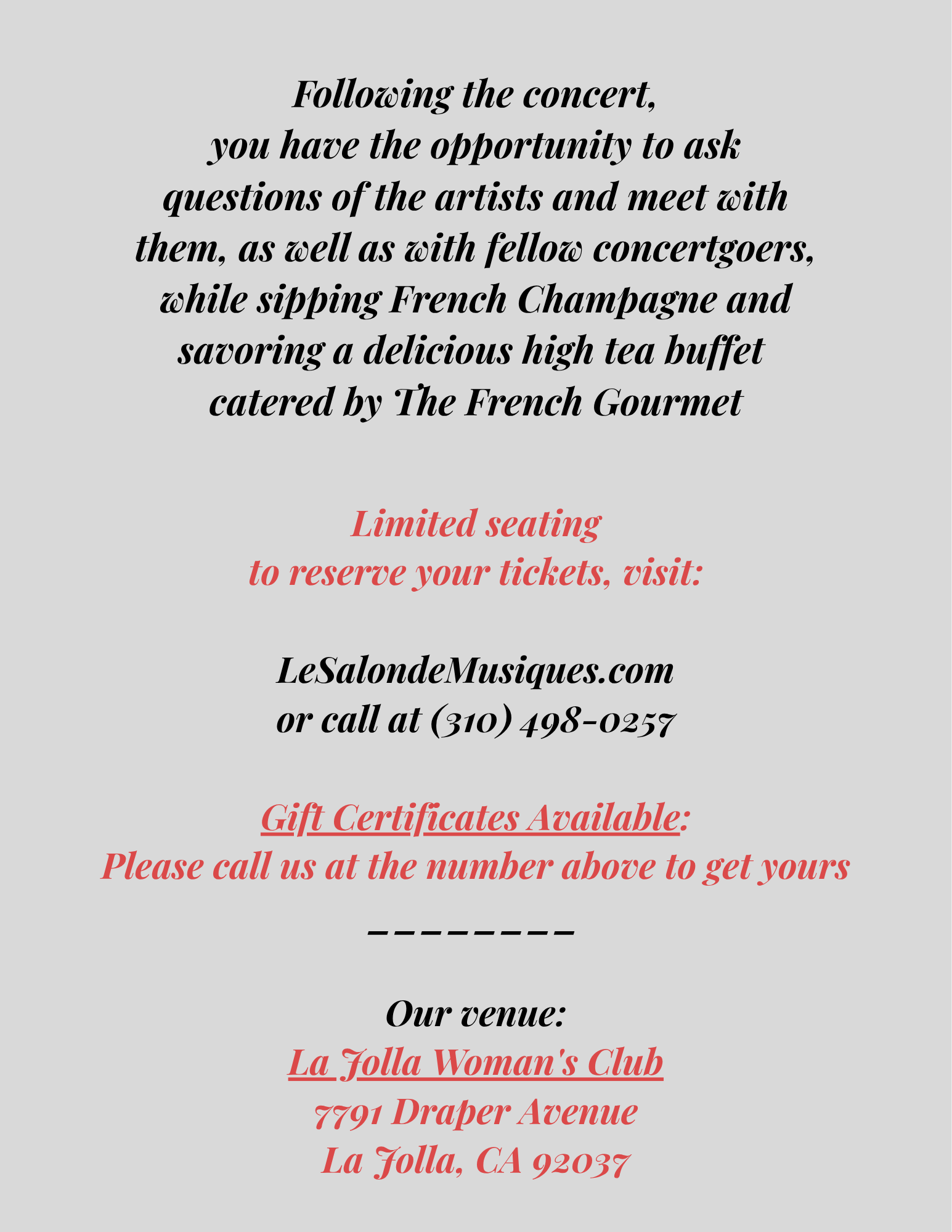 To reserve your ticket, visit LeSalondeMusiques.com or call (310) 498-0257