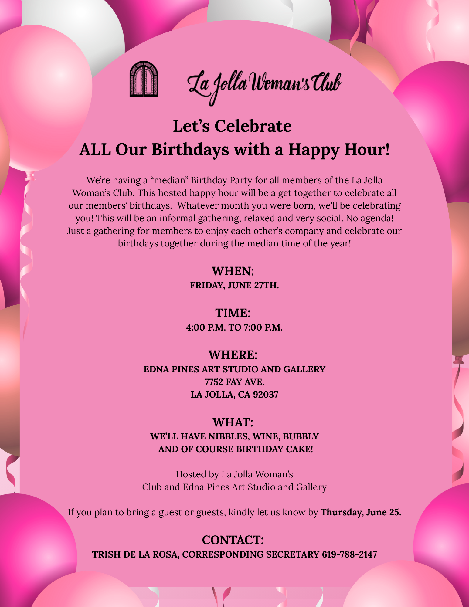 Median Birthday Celebration Friday, June 27, 2025 4:00 PM 7:00 PM 16:00 19:00 La Jolla Woman's Club 7752 Fay Avenue La Jolla, CA, 92037 United States (map) Google Calendar ICS