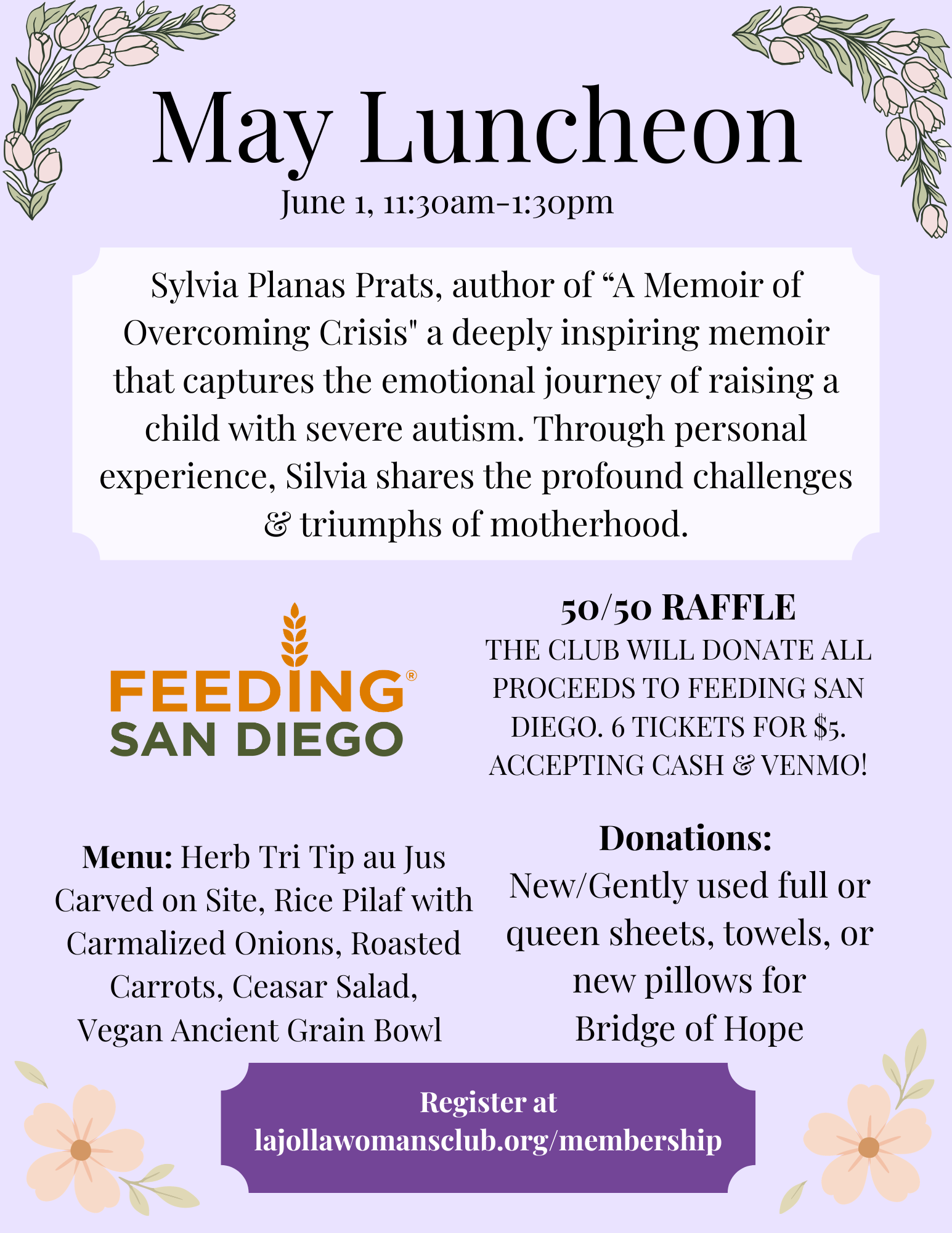 LJWC Membership Lunch Meeting Monday, May 4, 2026 11:30 AM 1:00 PM 11:30 13:00 La Jolla Woman's Club 7791 Draper Avenue La Jolla, CA, 92037 United States (map) Google Calendar ICS La Jolla Woman’s ClubLJWC Membership Lunch Meeting Quick View Member Luncheon $40.00 Month: Select Month December 1st 2025 January 5th 2026 February 2nd 2026 March 2nd 2026 April 6th 2026 May 4th 2026 June 1st 2026 October 5th 2026 November 2nd 2026 December 7th 2026 Menu option: Select Menu option Standard Vegetarian Gluten Free Add to cart