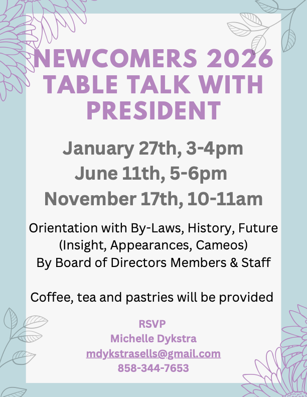 New Member Table Talk with President Tuesday, July 22, 2025 10:00 AM 11:00 AM 10:00 11:00 La Jolla Woman's Club 7791 Draper Avenue San Diego, CA, 92037 United States (map) Google Calendar ICS